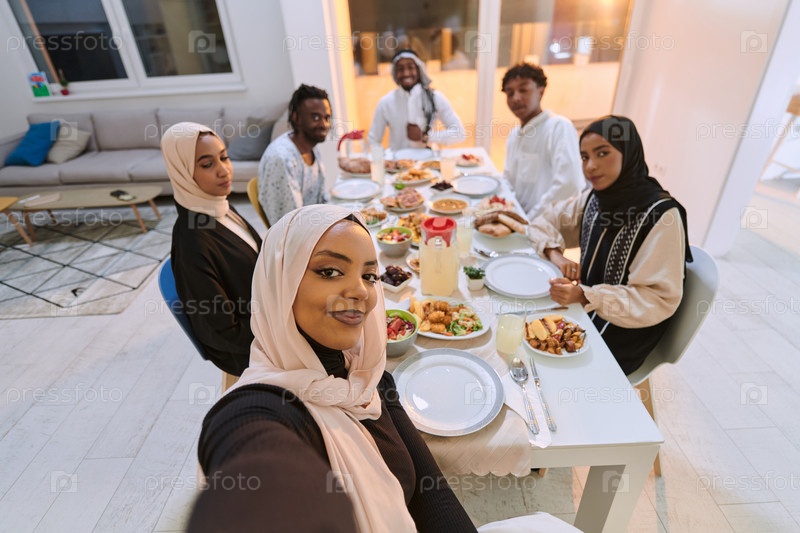 Традиционная мусульманская семья запечатлела радость совместной трапезы ифтар во время священного месяца Рамадан с помощью веселого семейного селфи, сочетающего культурное богатство, семейную близость и дух праздника в одном снимке