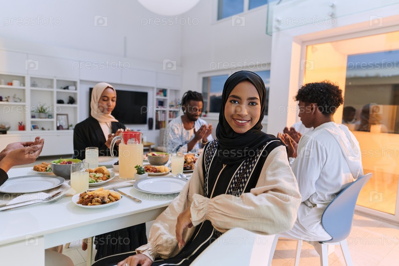 В священный месяц Рамадан разнообразная мусульманская семья объединяется в духовном единстве, горячо молясь Богу перед разговением, фиксируя момент коллективной преданности, культурного разнообразия и семейной радости посреди священного праздника