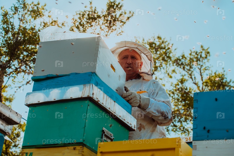 Пчеловод проверяет мед на рамке улья в поле. Производитель натуральных здоровых продуктов питания на пасеке. Владелец малого бизнеса работает с пчелами и ульями на пасеке