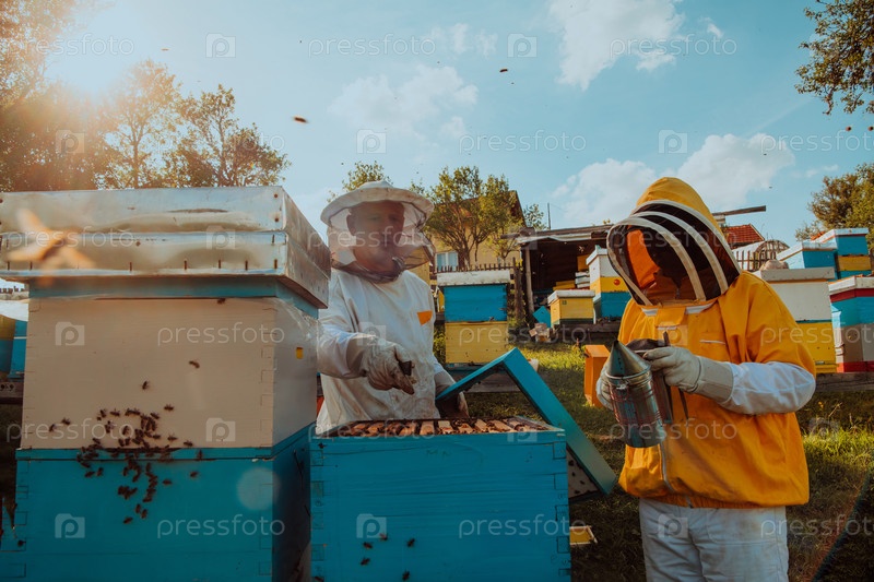 Пчеловоды проверяют мед на рамке улья в поле. Владельцы малого бизнеса на пасеке. Производитель натуральных здоровых продуктов питания работает с пчелами и ульями на пасеке