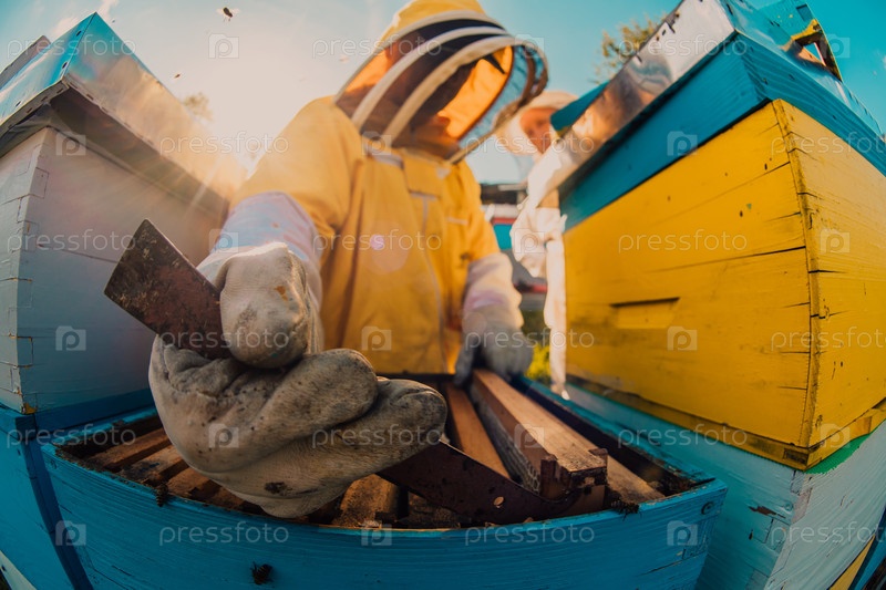 Пчеловод проверяет мед на рамке улья в поле. Владелец малого бизнеса на пасеке. Производитель натуральных здоровых продуктов питания работает с пчелами и ульями на пасеке