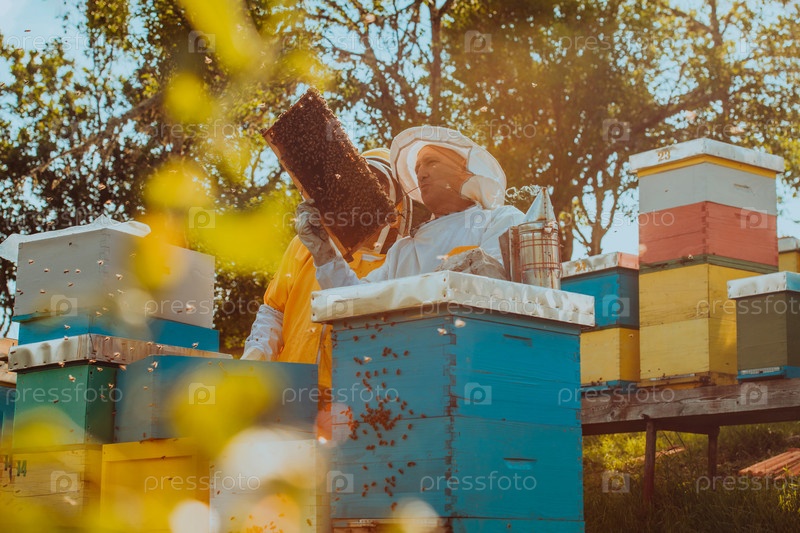 Пчеловоды проверяют мед на рамке улья в поле. Владельцы малого бизнеса на пасеке. Производитель натуральных здоровых продуктов питания работает с пчелами и ульями на пасеке