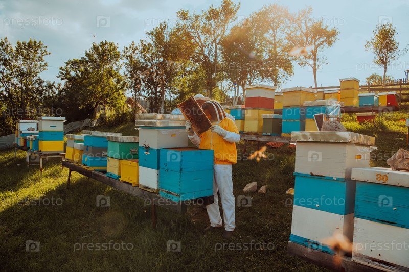 Пчеловоды проверяют мед на рамке улья в поле. Владельцы малого бизнеса на пасеке. Производитель натуральных здоровых продуктов питания работает с пчелами и ульями на пасеке