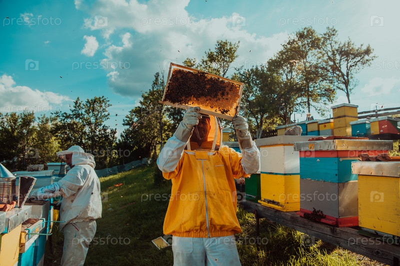 Пчеловоды проверяют мед на рамке улья в поле. Владельцы малого бизнеса на пасеке. Производитель натуральных здоровых продуктов питания работает с пчелами и ульями на пасеке