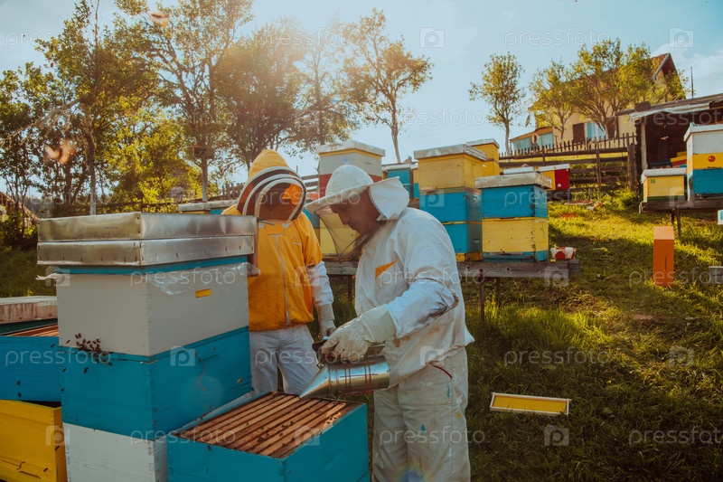 Пчеловоды проверяют мед на рамке улья в поле. Владельцы малого бизнеса на пасеке. Производитель натуральных здоровых продуктов питания работает с пчелами и ульями на пасеке