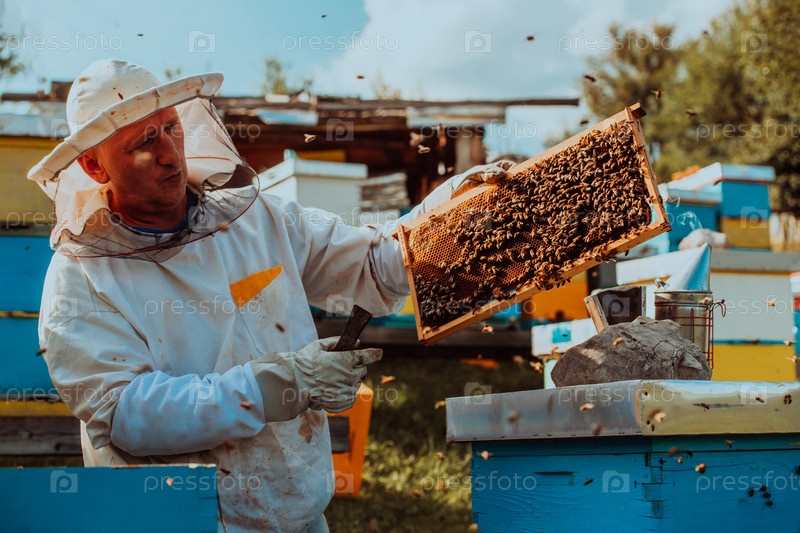 Пчеловод проверяет мед на рамке улья в поле. Пчеловод на пасеке. Пчеловод работает с пчелами и ульями на пасеке