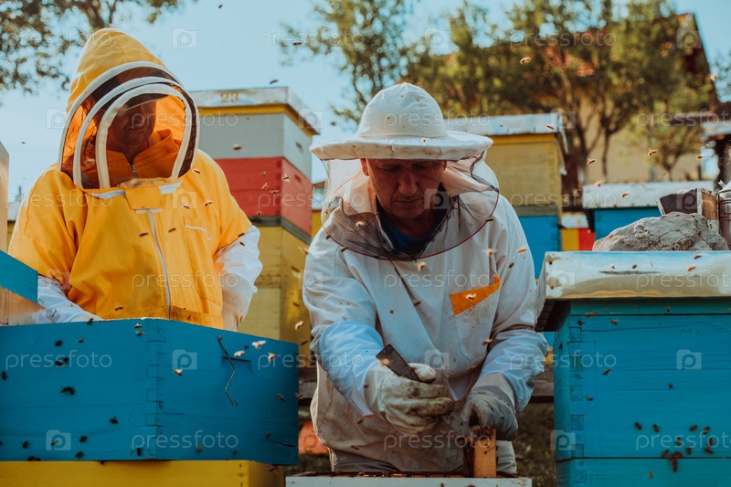 Пчеловоды проверяют мед на рамке улья в поле. Владельцы малого бизнеса на пасеке. Производитель натуральных здоровых продуктов питания работает с пчелами и ульями на пасеке
