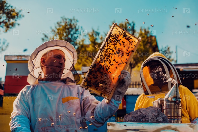 Пчеловоды проверяют мед на рамке улья в поле. Владельцы малого бизнеса на пасеке. Производитель натуральных здоровых продуктов питания работает с пчелами и ульями на пасеке
