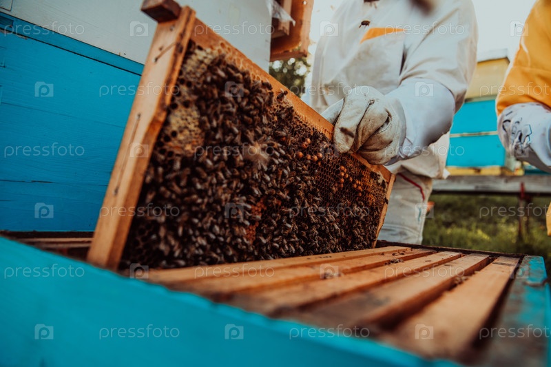Пчеловоды проверяют мед на рамке улья в поле. Владельцы малого бизнеса на пасеке. Производитель натуральных здоровых продуктов питания работает с пчелами и ульями на пасеке