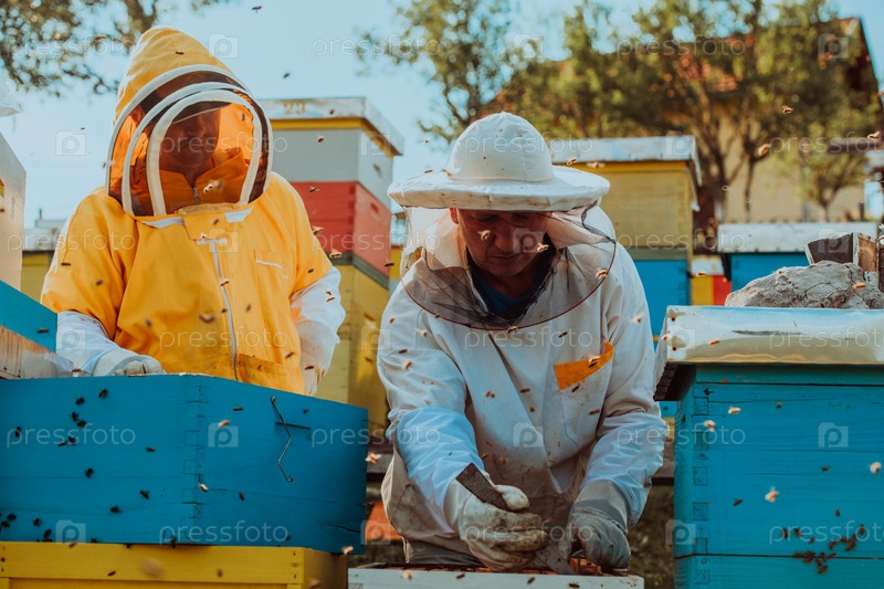 Пчеловоды проверяют мед на рамке улья в поле. Владельцы малого бизнеса на пасеке. Производитель натуральных здоровых продуктов питания работает с пчелами и ульями на пасеке