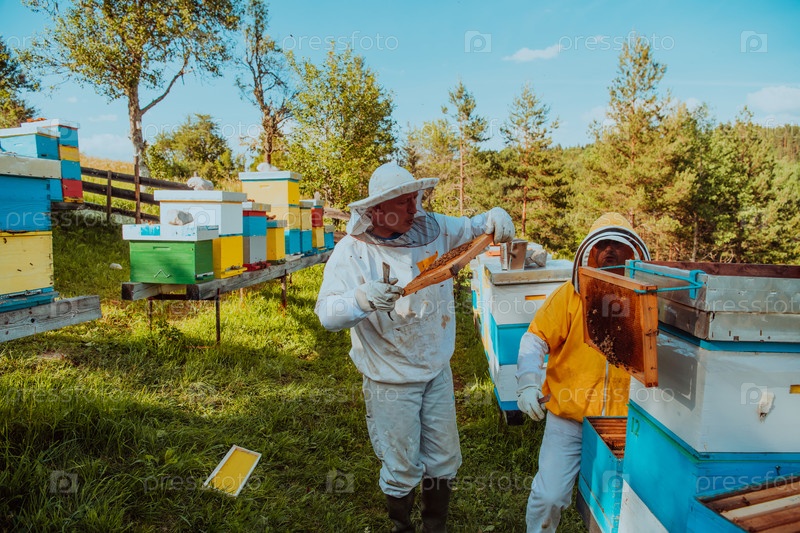 Пчеловоды проверяют мед на рамке улья в поле. Владельцы малого бизнеса на пасеке. Производитель натуральных здоровых продуктов питания работает с пчелами и ульями на пасеке