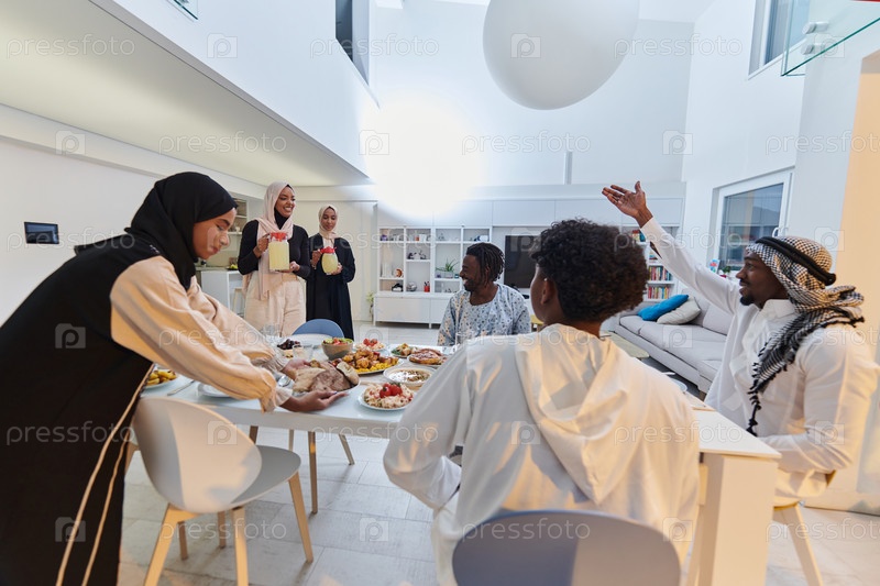В священный месяц Рамадан мусульманская семья радостно собирается за столом, с нетерпением ожидая общего ифтара, занимаясь приготовлением общей трапезы и объединяясь в ожидании коллективной молитвы, воплощая дух единения, преданности и культурный праздник