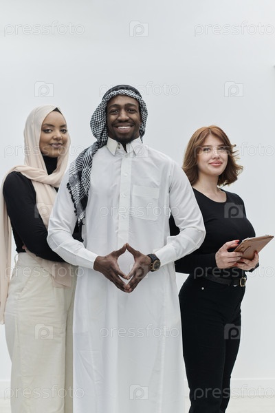 Арабский бизнесмен уверенно стоит рядом с двумя деловыми женщинами, изображая уравновешенную и разнообразную команду, олицетворяющую амбиции, инновации и дальновидное лидерство на первозданном белом фоне