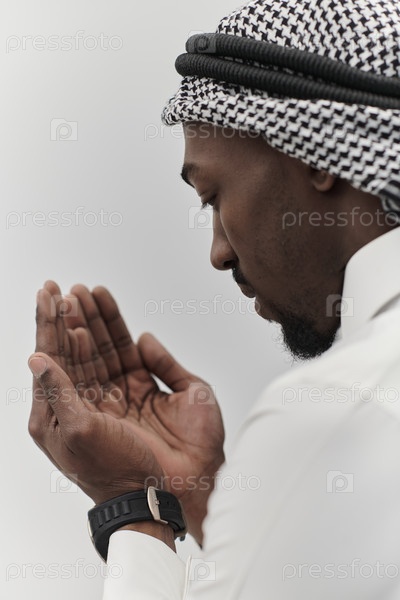 Афроамериканский мусульманин поднимает руки в молитве, ища утешения и преданности Богу, стоя изолированно на безмятежном белом фоне, символизируя глубокое выражение веры и созерцания