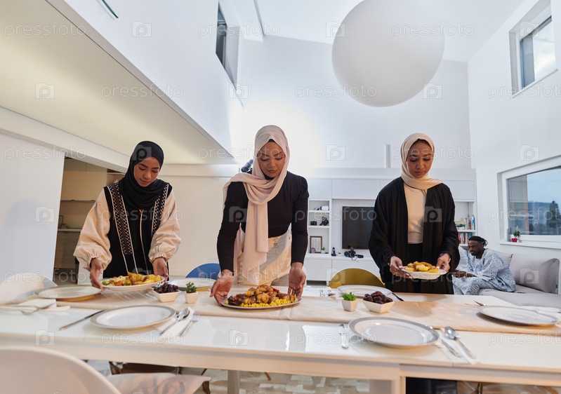 Группа молодых арабских женщин собирается вместе, чтобы с любовью подготовить стол ифтар во время священного мусульманского месяца Рамадан, воплощая в своих кулинарных приготовлениях суть общинного единства, культурных традиций и радостного ожидания