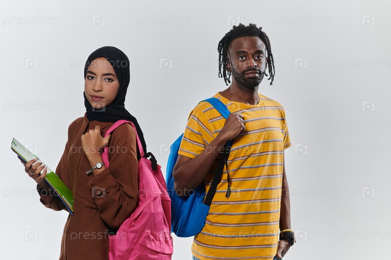 На чистом белом фоне двое студентов, афроамериканский молодой человек и женщина в хиджабе, совместно используют ноутбуки, демонстрируя технологические возможности и инклюзивное образование, олицетворяя единство и разнообразие в академическом пути