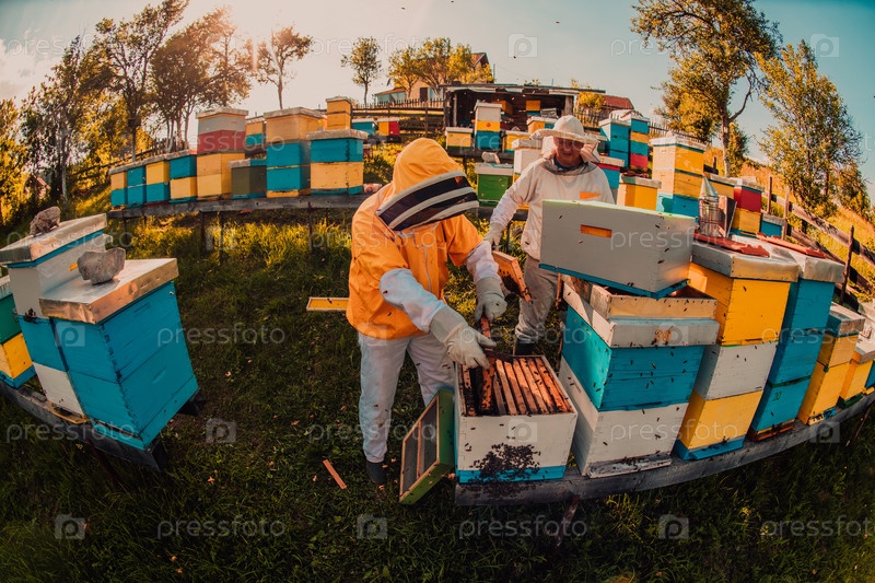 Пчеловоды проверяют мед на рамке улья в поле. Владельцы малого бизнеса на пасеке. Производитель натуральных здоровых продуктов питания работает с пчелами и ульями на пасеке
