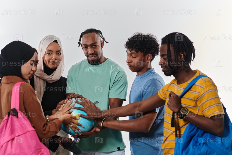 Разнообразная группа студентов собралась по всему миру, поглощенная исследованиями и учебой, их яркая энергия запечатлена на первозданном белом фоне, символизируя единство и любопытство в их образовательном путешествии