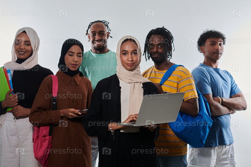 Группа разнообразных студентов занимается современными образовательными практиками, используя различные технологические инструменты, такие как ноутбуки, планшеты и смартфоны, на чистом белом фоне, иллюстрируя современный подход к совместному обучению и до