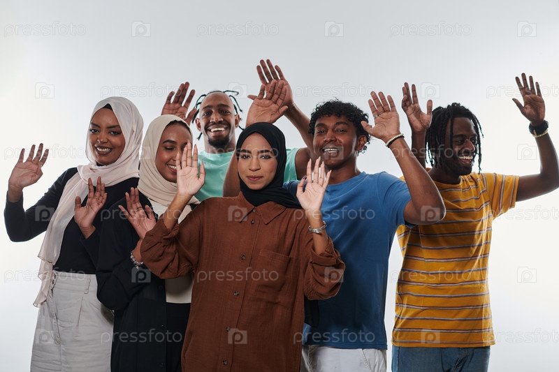 Ликующая и разнообразная группа, в том числе афроамериканец и девушки в хиджабе, энергично машут руками и празднуют, олицетворяя яркость студенческой жизни на белом фоне, символизируя единство, культурное разнообразие и радостный дух общего опыта