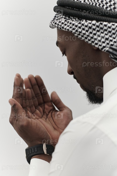 Афроамериканский мусульманин поднимает руки в молитве, ища утешения и преданности Богу, стоя изолированно на безмятежном белом фоне, символизируя глубокое выражение веры и созерцания