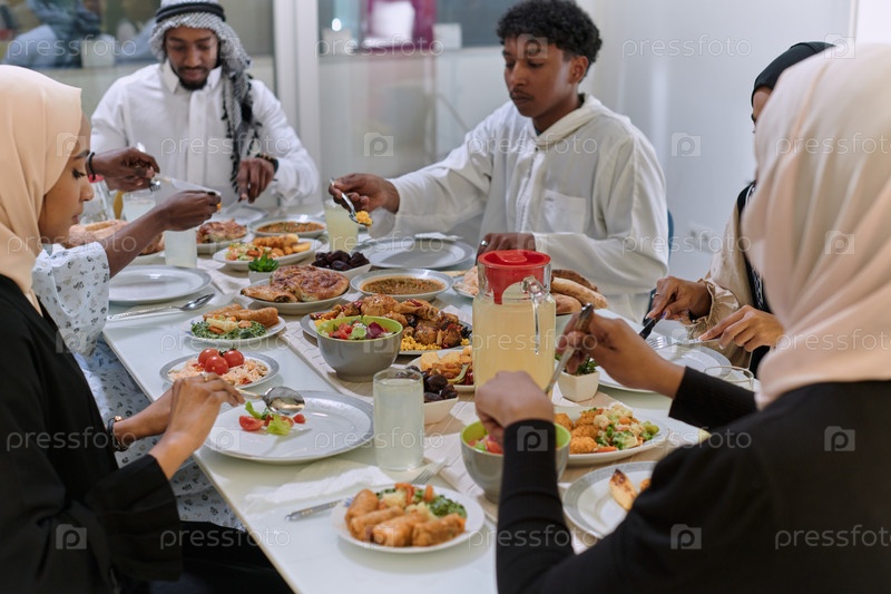 Традиционная и разнообразная мусульманская семья собирается вместе, чтобы разделить вкусный ифтар во время священного месяца Рамадан, воплощая суть семейной радости, культурного богатства и духовного единства в их общем празднике