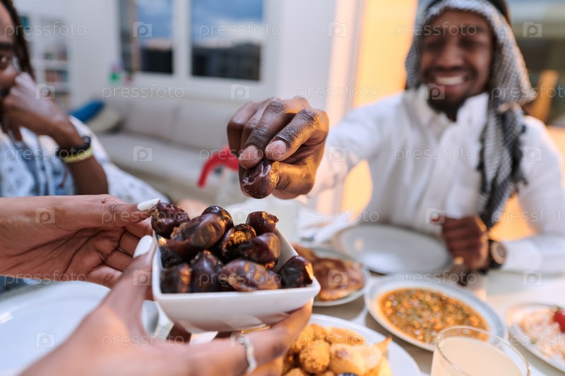 На пронзительном крупном плане разные руки мусульманской семьи деликатно сжимают свежие финики, символизируя прекращение поста во время священного месяца Рамадан, запечатлевая момент культурного единства, общих традиций и радостного ожидания общего ифтара