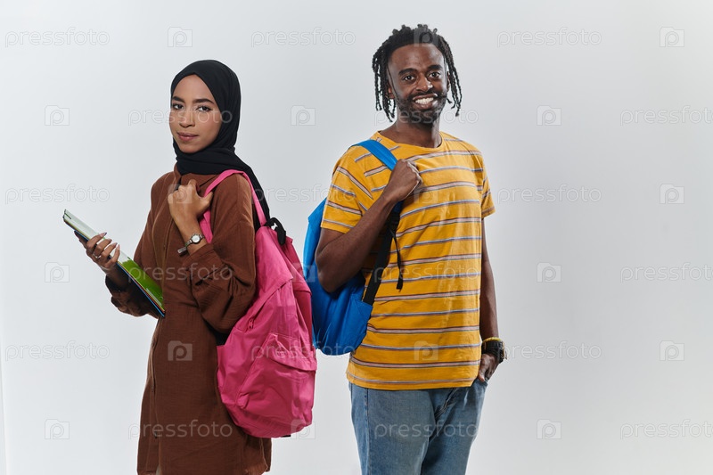 На чистом белом фоне двое студентов, афроамериканский молодой человек и женщина в хиджабе, совместно используют ноутбуки, демонстрируя технологические возможности и инклюзивное образование, олицетворяя единство и разнообразие в академическом пути
