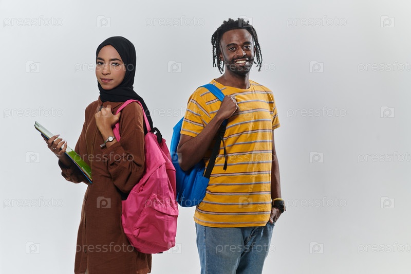 На чистом белом фоне двое студентов, афроамериканский молодой человек и женщина в хиджабе, совместно используют ноутбуки, демонстрируя технологические возможности и инклюзивное образование, олицетворяя единство и разнообразие в академическом пути