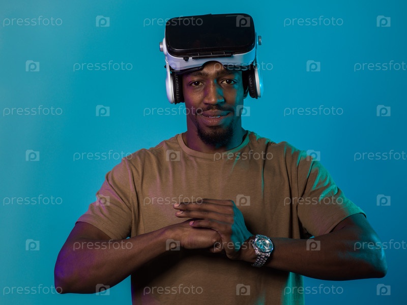 В авангардной сцене афроамериканец участвует в передовых играх виртуальной реальности, используя очки VR для погружения в футуристические боксерские игры, расположенные на ярко-синем фоне, демонстрируя плавное сочетание технологий, инноваций и взаимодейст