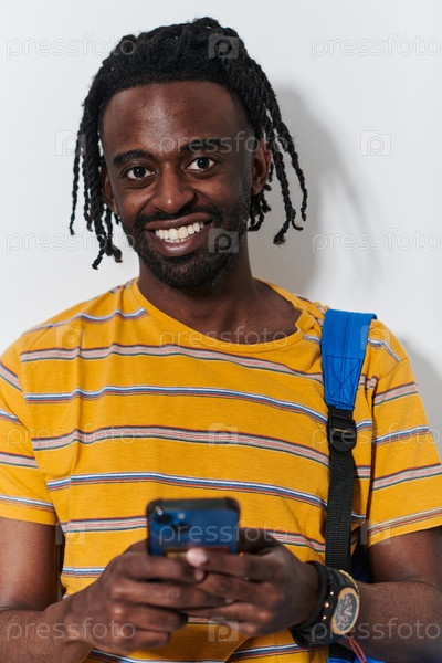 Афроамериканский подросток пользуется своим смартфоном на первозданном белом фоне, воплощая суть современных цифровых технологий и молодежной культуры