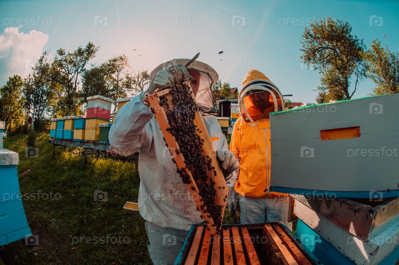 Пчеловоды проверяют мед на рамке улья в поле. Владельцы малого бизнеса на пасеке. Производитель натуральных здоровых продуктов питания работает с пчелами и ульями на пасеке