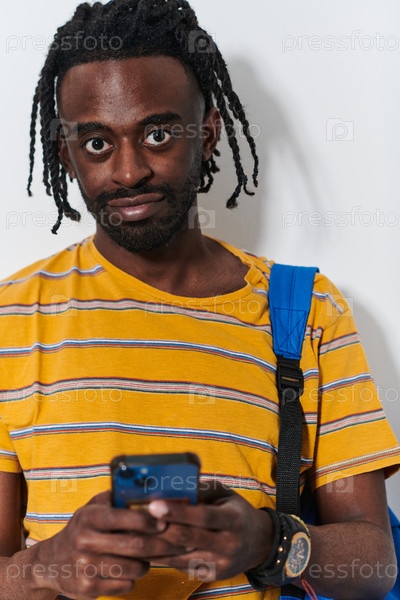 Афроамериканский подросток пользуется своим смартфоном на девственно белом фоне, воплощая суть современных цифровых технологий и молодежной культуры