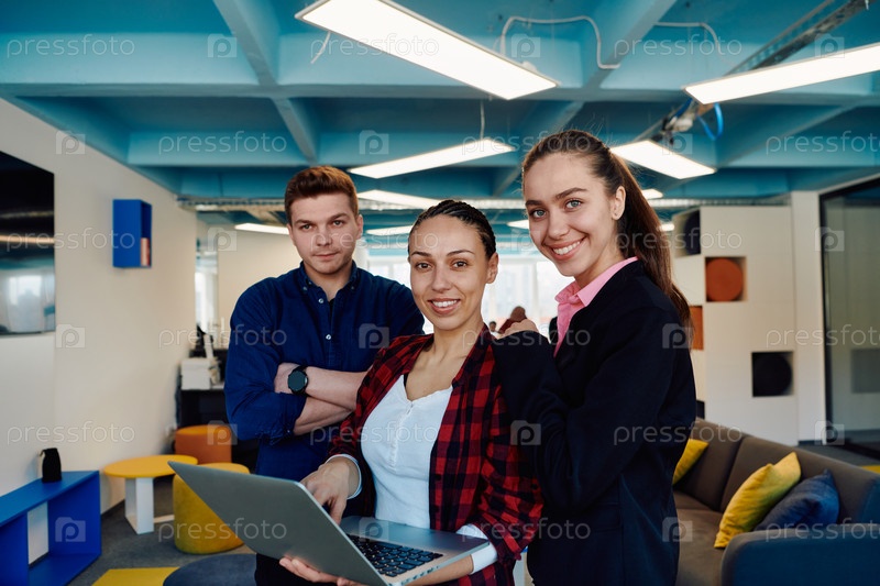 Молодая команда бизнес-профессионалов позирует для портрета офиса стартапа, излучая уверенность и амбиции, при этом одна женщина держит ноутбук, что символизирует инновации и сотрудничество в предпринимательстве