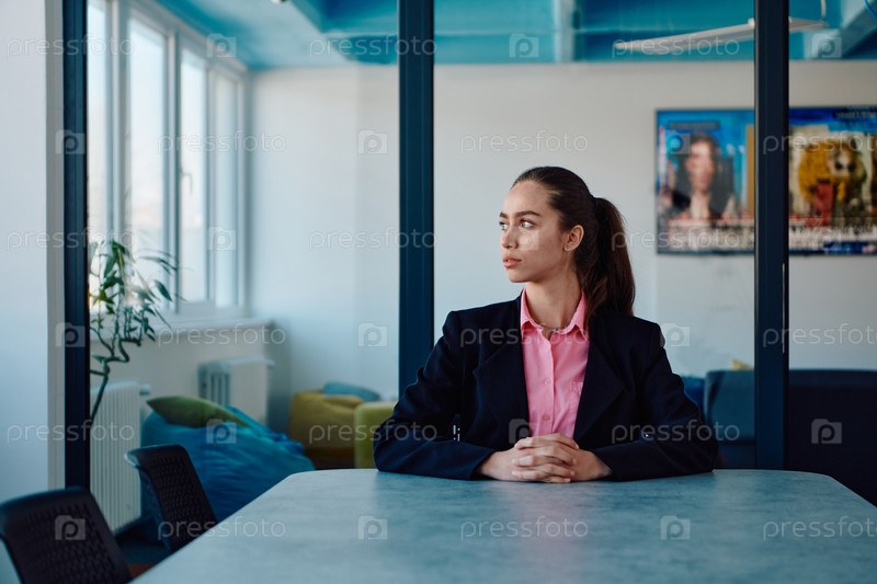 Успешная молодая женщина-лидер в костюме и розовой рубашке сидит в современном стеклянном офисе с решительной улыбкой