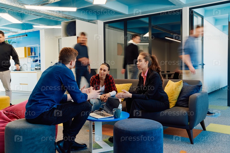 Многонациональная стартап-бизнес-команда встречается в современном ярком коворкинг-офисе под открытым небом. Мозговой штурм, работа на ноутбуке. Группа коллег ходит в размытом состоянии