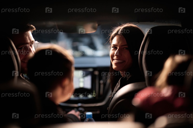 В ночные часы счастливая семья вместе наслаждается игровыми моментами в машине, путешествуя по ночной дороге, освещенной светом фар и наполненной смехом и радостью