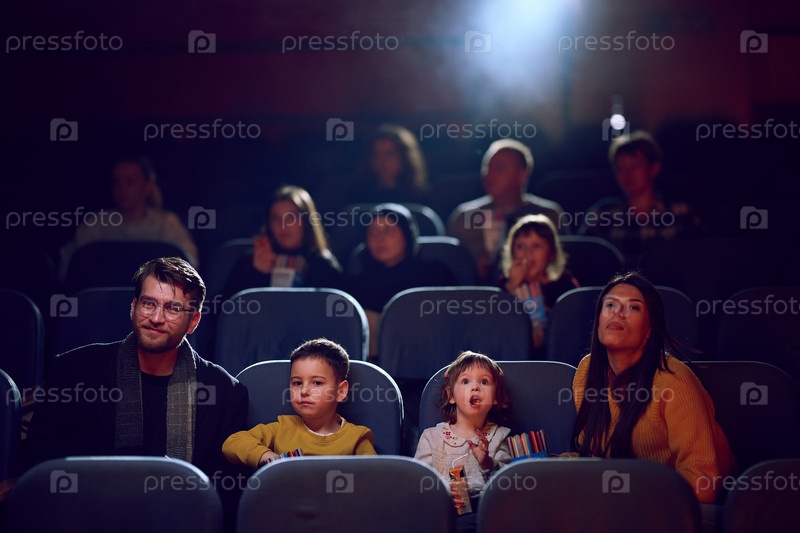 Современная семья приятно проводит время вместе в кинотеатре, наслаждаясь попкорном во время просмотра фильма со своими детьми
