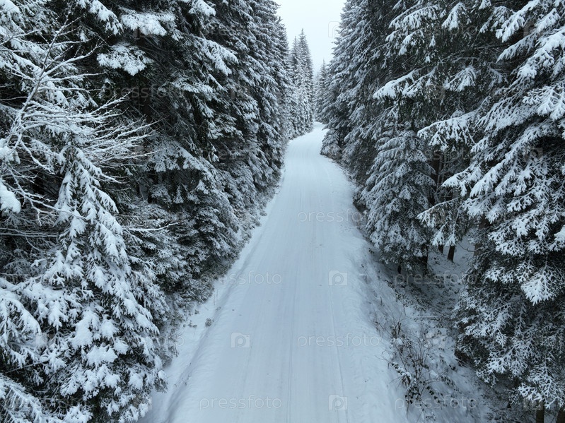 Туманный закат на Снежных горах с точки зрения воздушного беспилотника. Леса пересекают проселочные тропы в соснах зимой со свежей проселочной дорогой