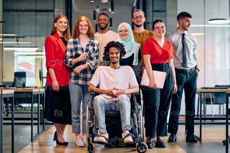 Разнообразная группа молодых бизнесменов, идущих по коридору в застекленном офисе современного стартапа, включая человека в инвалидной коляске и женщину в хиджабе