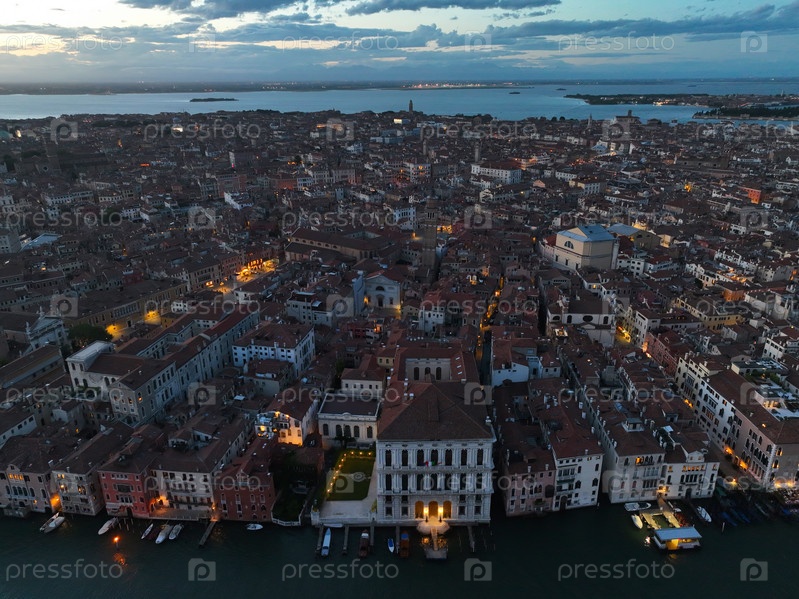 Панорамная достопримечательность Венеции на закате или ночью, вид с воздуха на площадь Сан-Марко