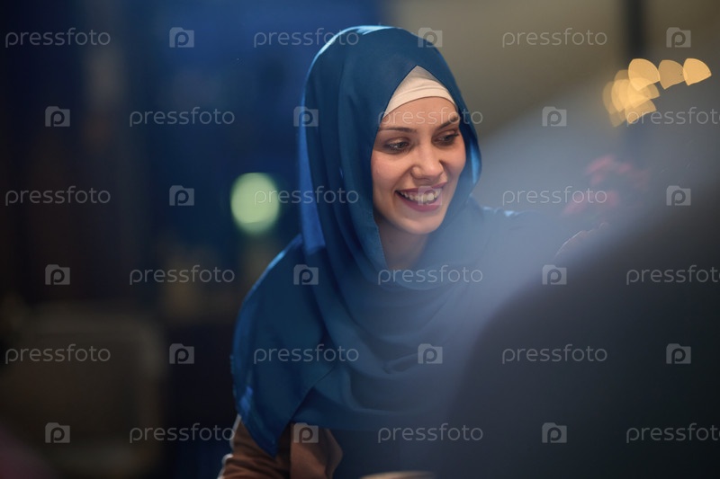 В современном ресторане красивая европейская мусульманка изящно наслаждается атмосферой и кулинарными изысками во время священного месяца Рамадан, воплощая элегантность и духовное спокойствие среди культурного праздника