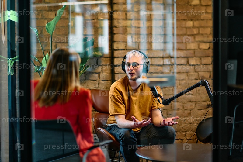 Собрание молодых бизнес-профессионалов, некоторые из которых сидят в офисе со стеклянными стенами, ведут оживленную беседу и записывают онлайн-подкаст, олицетворяющий современное сотрудничество и динамичное взаимодействие
