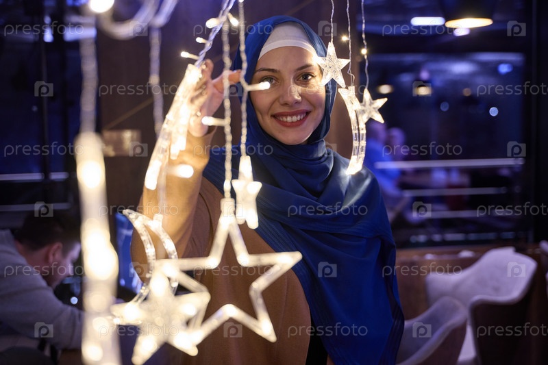 В обстановке современного ресторана женщина в хиджабе делает селфи на фоне светящихся огней, демонстрируя современный стиль и культурное разнообразие в модной городской обстановке