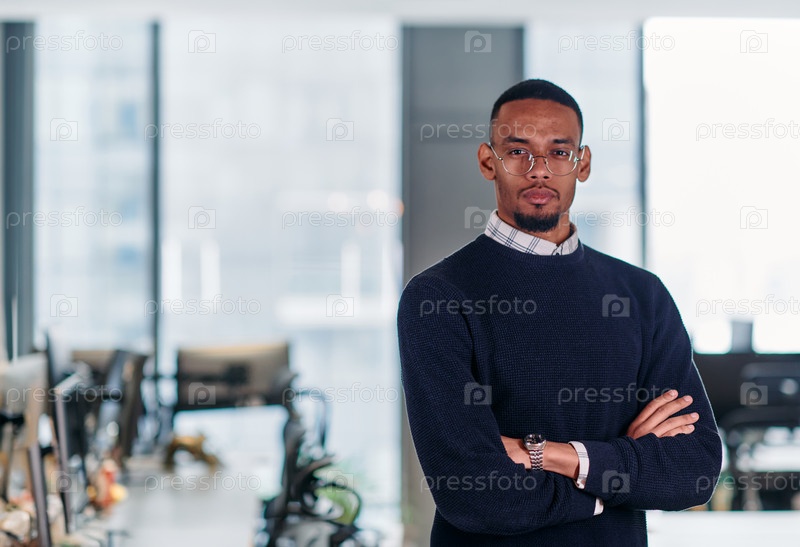 Уверенный афроамериканский бизнесмен позирует в современном стартап-офисе