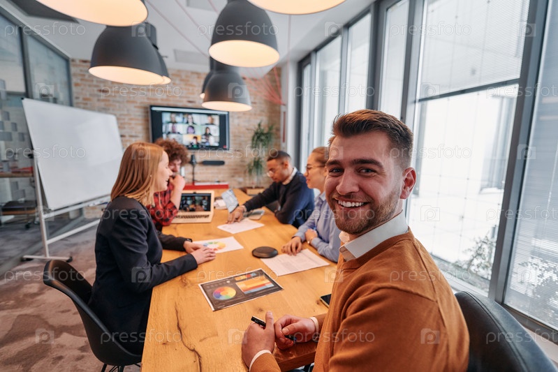 В оживленной атмосфере современного стартап-офиса разнообразная команда бизнес-профессионалов обсуждает различные проекты и разрабатывает новые бизнес-стратегии, олицетворяя креативность и инновации в предпринимательской среде