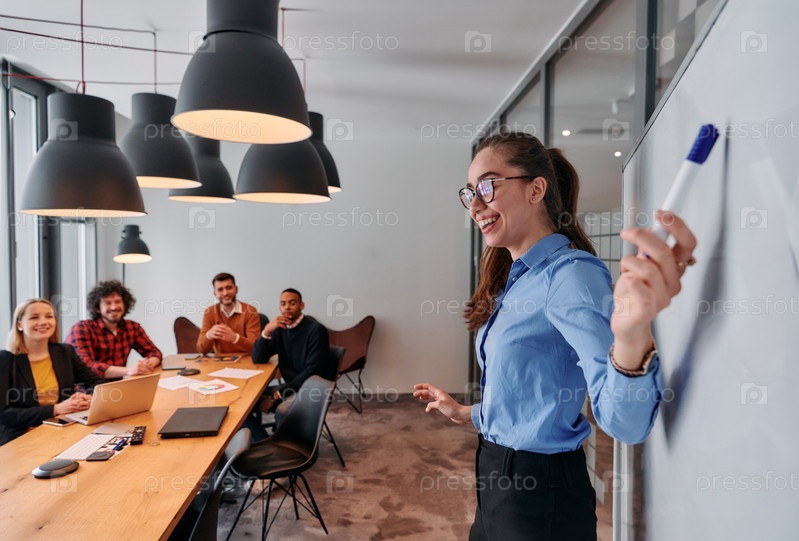 Бизнесмен, ведущая встречу с коллегами в современном офисе