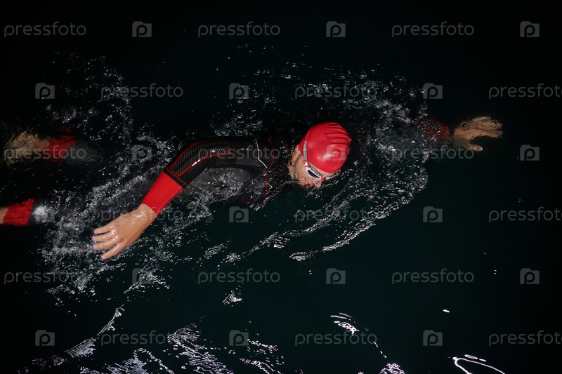 Решительный профессиональный триатлонист проходит тщательную ночную тренировку в холодной воде, демонстрируя преданность делу и стойкость в подготовке к предстоящим соревнованиям по триатлону по плаванию