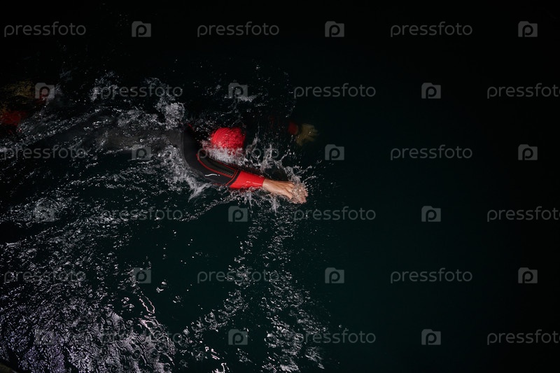 Решительный профессиональный триатлонист проходит тщательную ночную тренировку в холодной воде, демонстрируя преданность делу и стойкость в подготовке к предстоящим соревнованиям по триатлону по плаванию