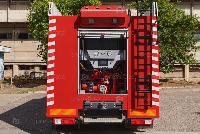 Крупный план основного противопожарного оборудования на современной пожарной машине, демонстрация инструментов и снаряжения, готовых к экстренному реагированию на опасные пожарные ситуации